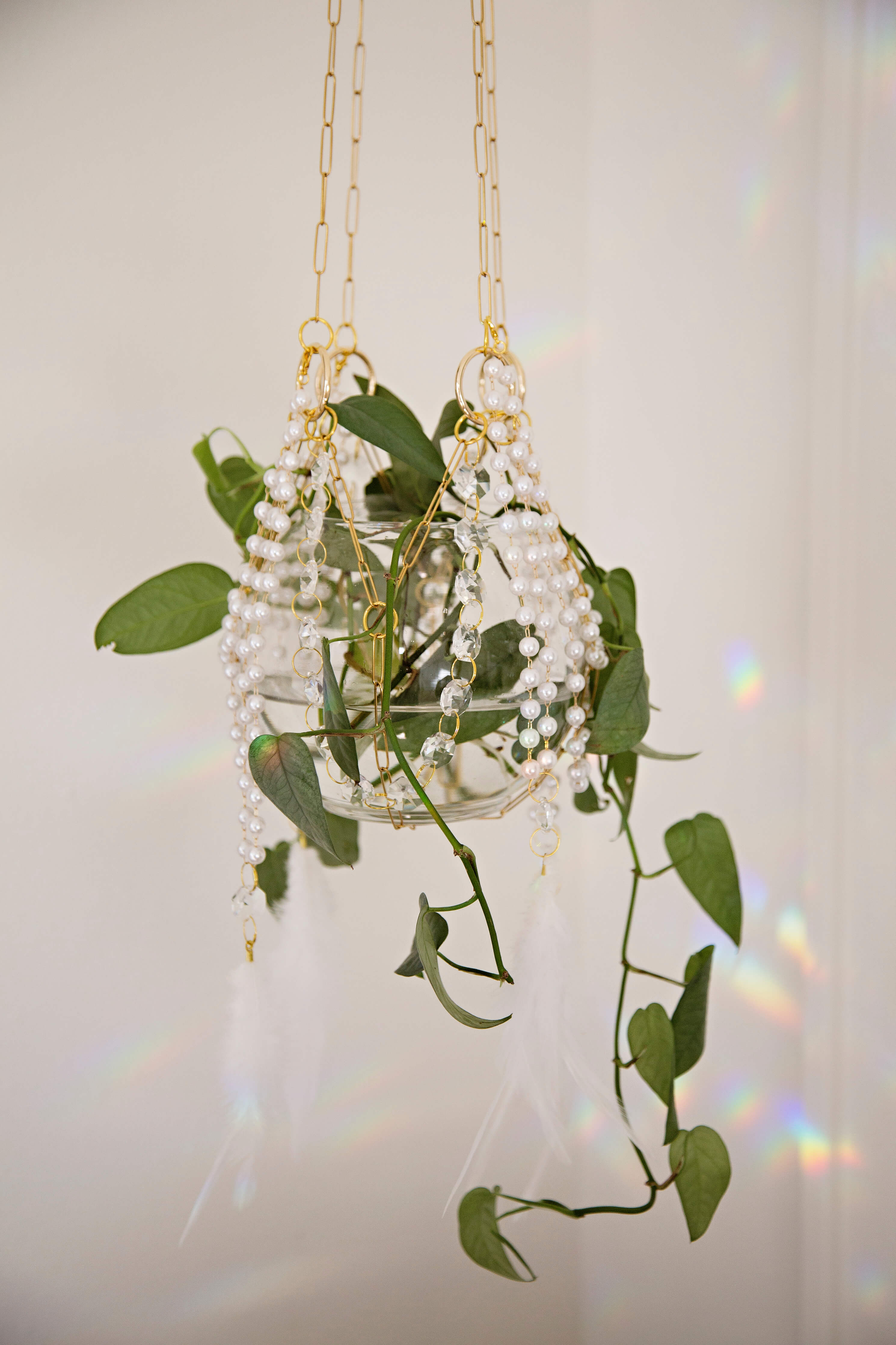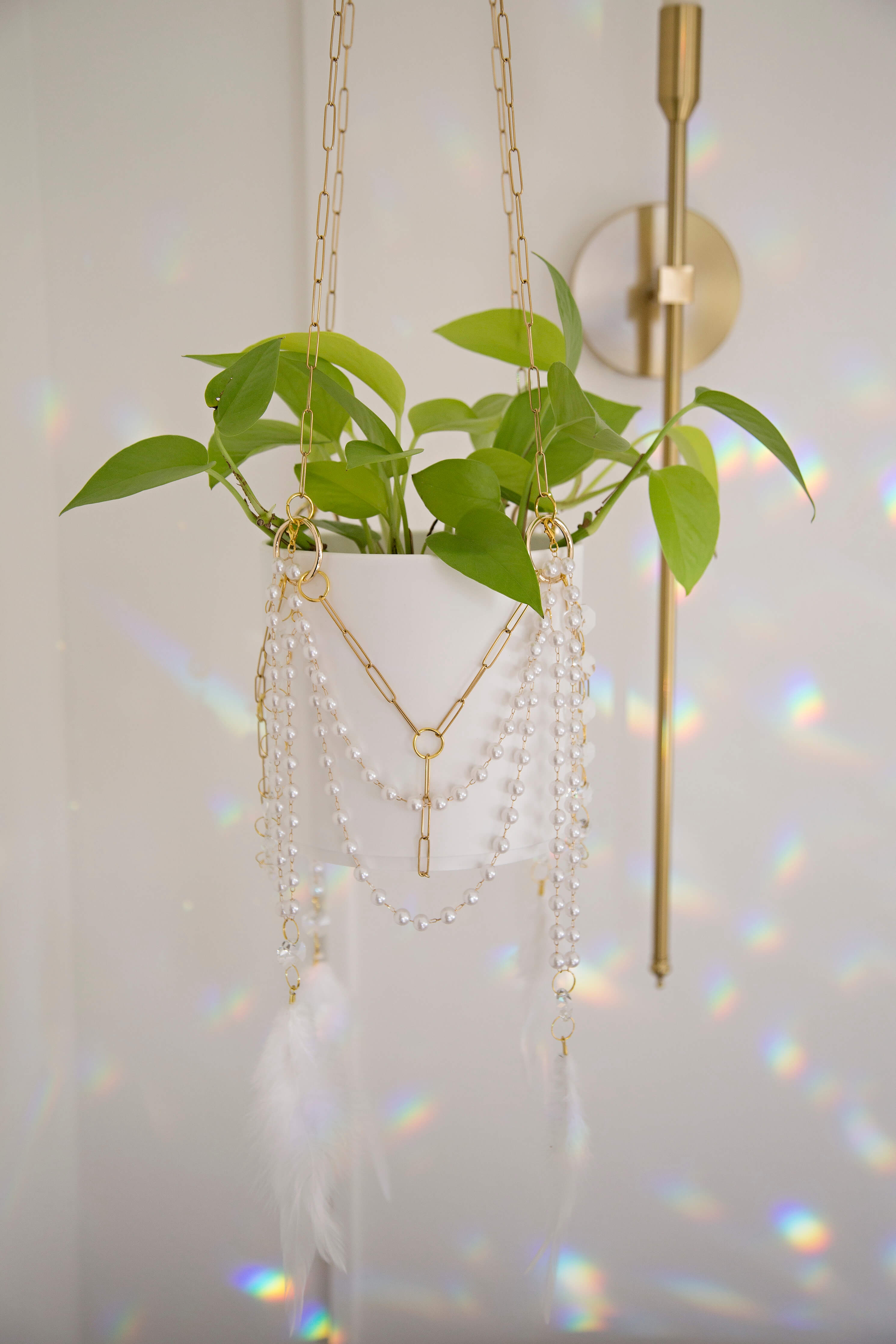 STAY ROOTED PEARL AND FEATHER GOLD CHAIN SUNCATCHER PLANT HANGER
